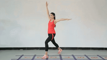 動(dòng)作解析:在普通前弓箭步接后弓箭步基礎(chǔ)上,增加了單手上舉,導(dǎo)致身體重心更難控制,所以對(duì)于身體協(xié)調(diào)性、穩(wěn)定性都提出了較高要求。