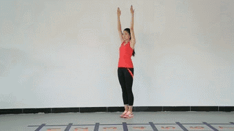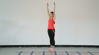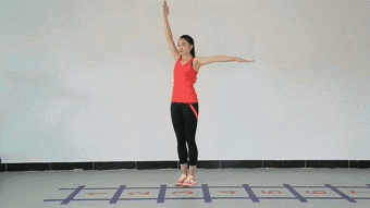 動(dòng)作解析:由單手上舉變雙手上舉,看上去動(dòng)作變化不大,卻大大增肌了動(dòng)作難度,對(duì)于腿部和腰腹的力量、穩(wěn)定性、協(xié)調(diào)性都是極高要求。
